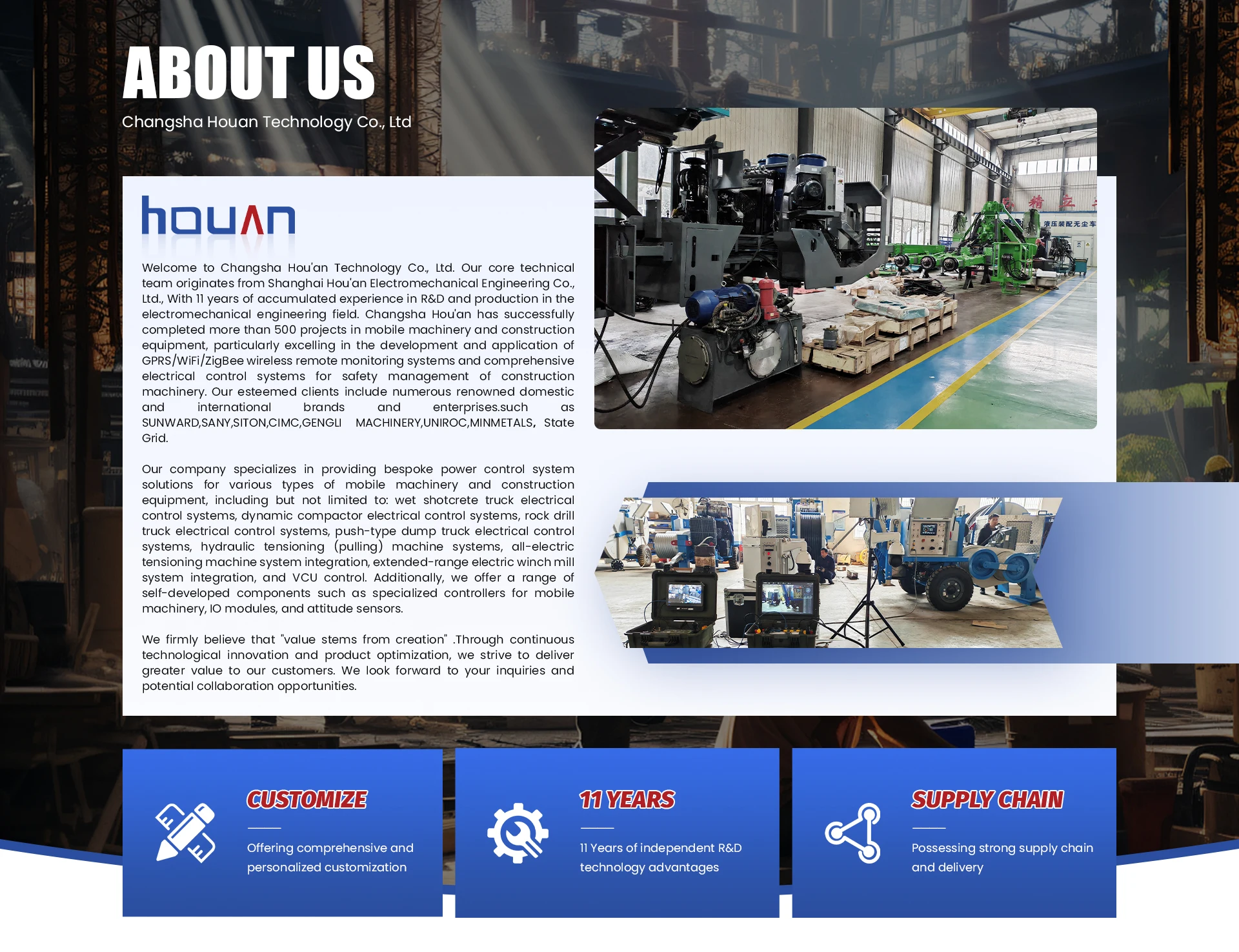 Productos principales:Servicio personalizado, sistemas de control eléctrico de compactador dinámico, sistemas de control eléctrico de camión perforador de roca, sistemas de control eléctrico de camión volquete de empuje, sistemas de control eléctrico de camión de hormigón proyectado húmedo